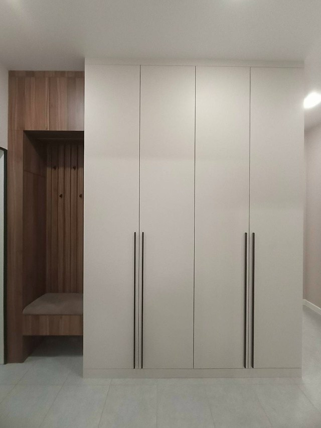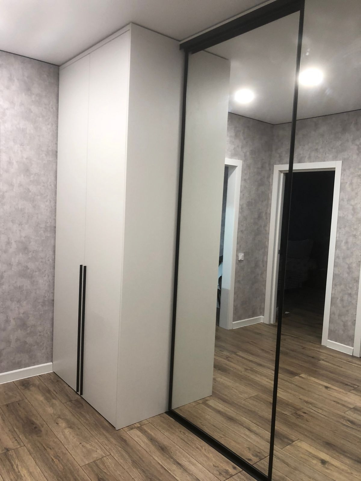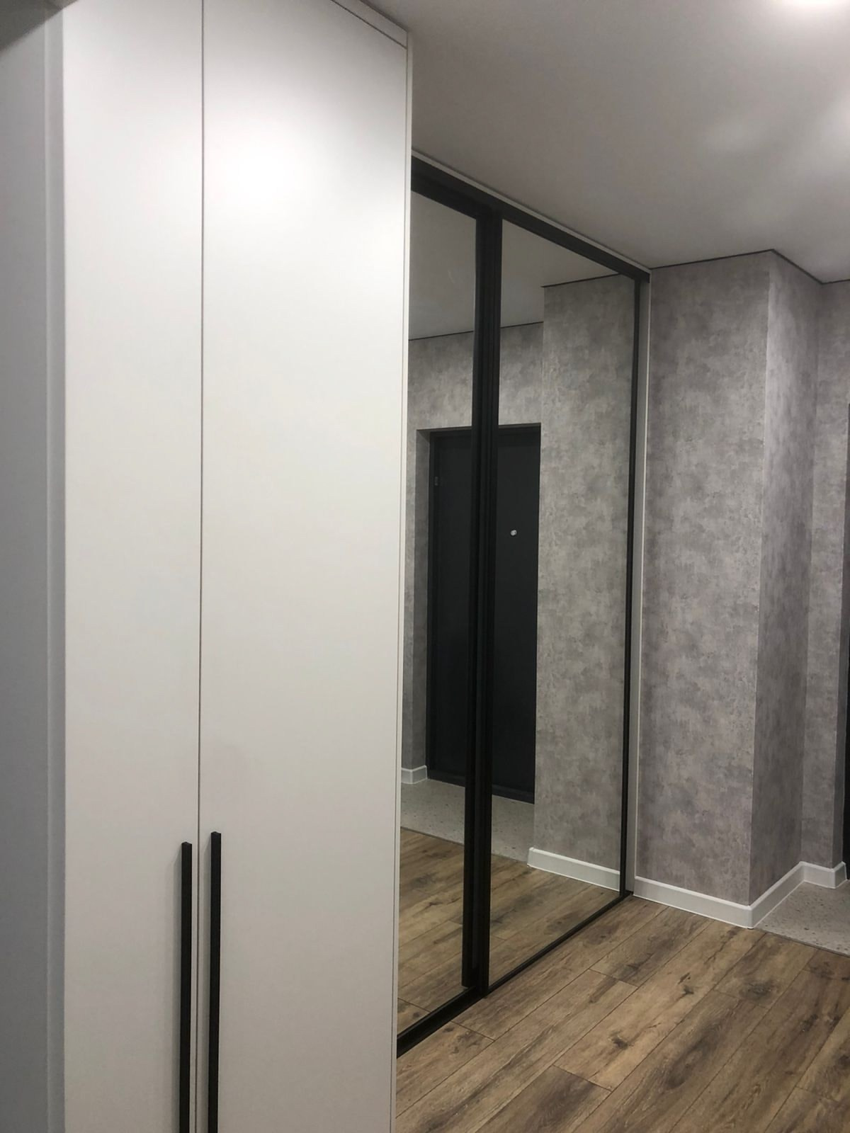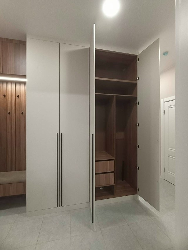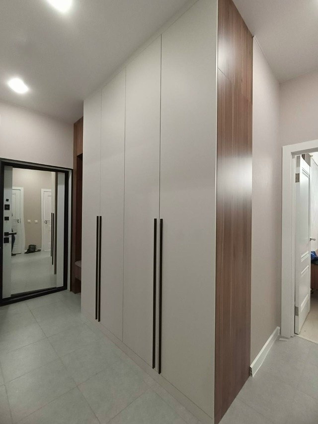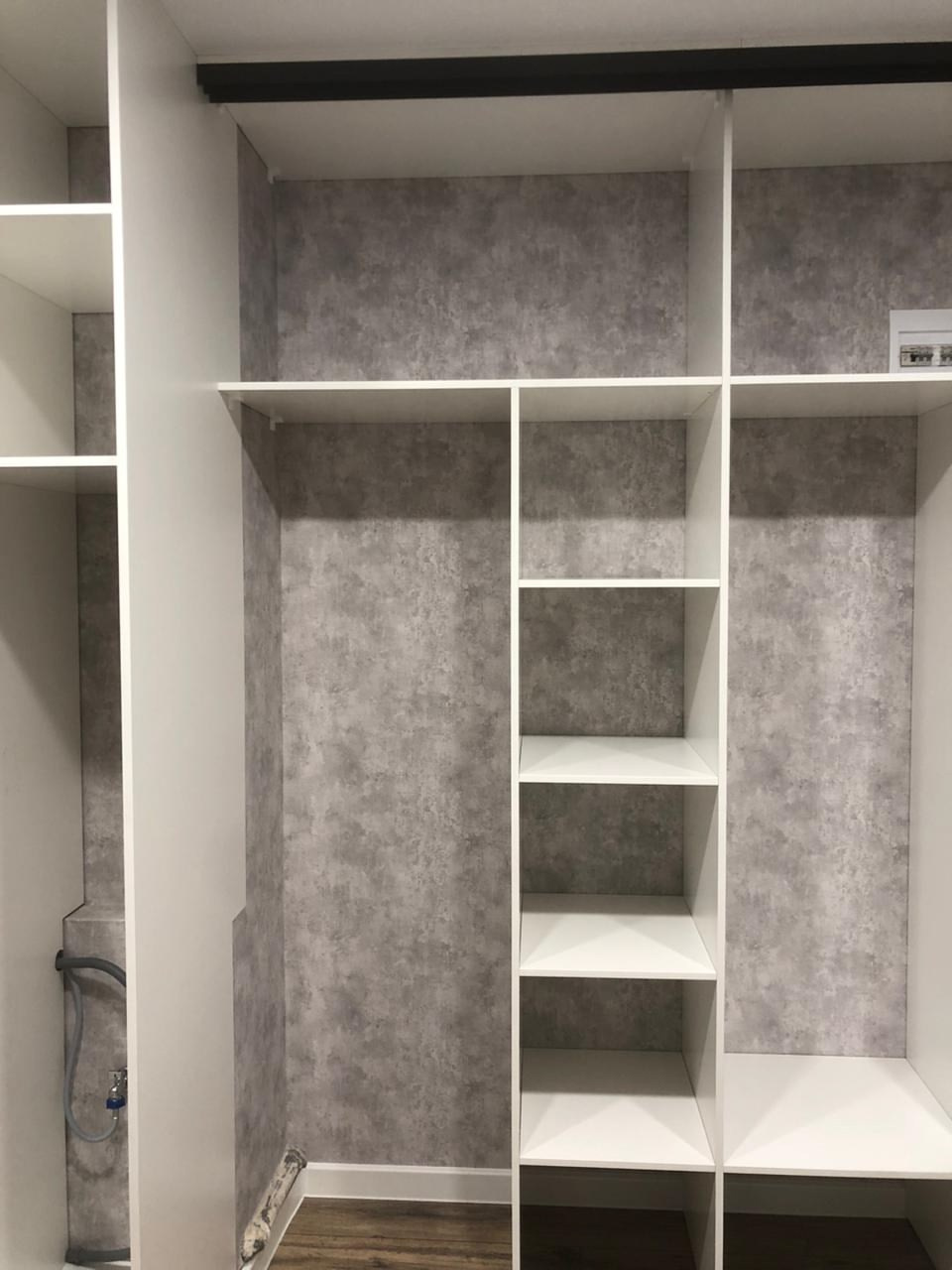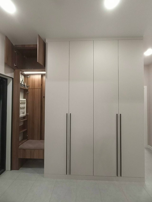 Основная задача прихожей, чтобы мебель смотрелась легко, стильно и самое главное была функциональной. В этой прихожей есть место для хранения вещей, ниша под гладильную доску и пылесос. Идеально обошли мебелью все выступы в стенах и закрыли трубы, розетки и электрический щиток.
